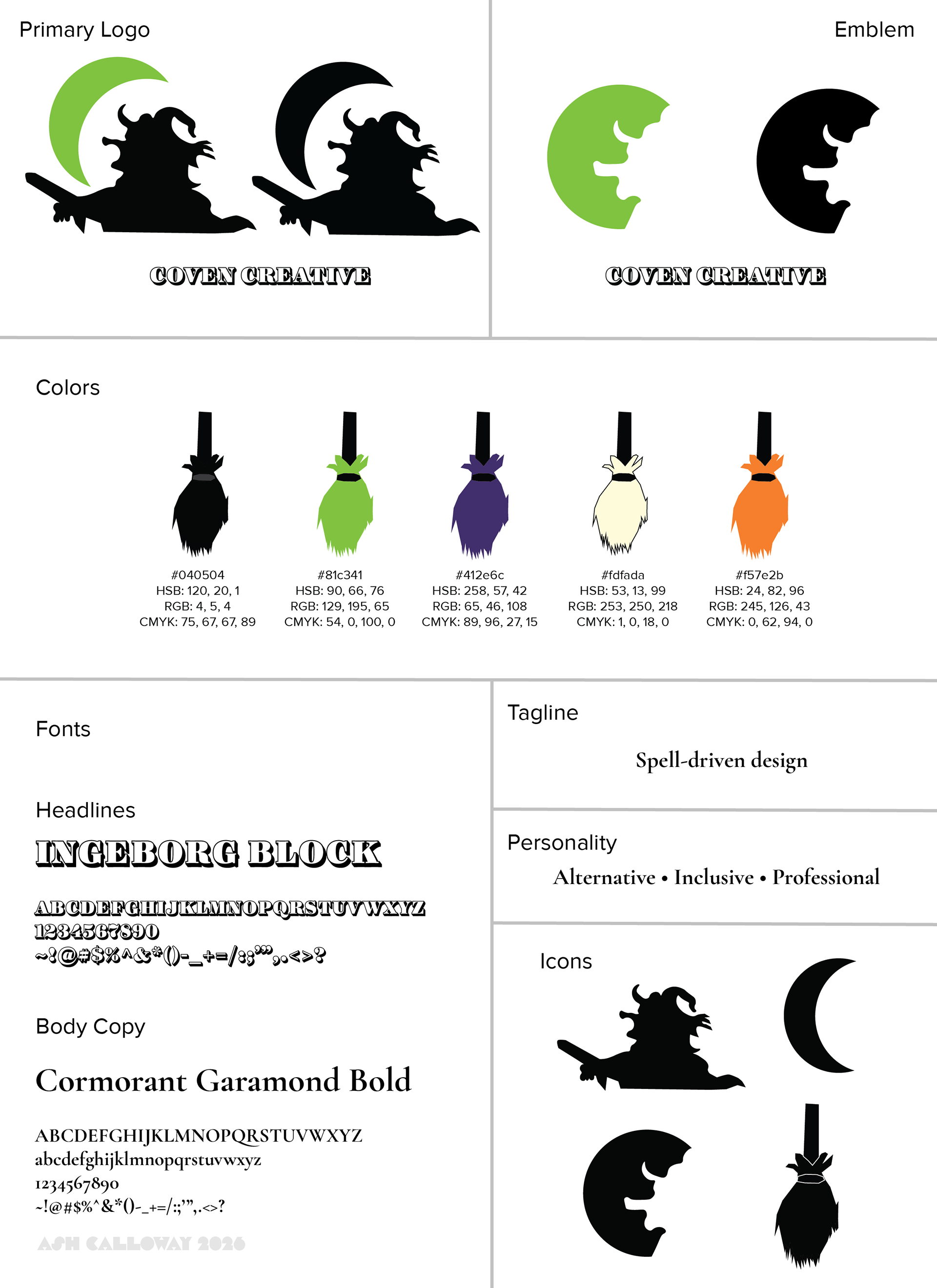 My first branding project since graduating! Introducing "Coven Creative", a graphic design agency brand designed for alternative clients and creatives. As an alternative person myself, I dislike the stigma that self-expression through tattoos and piercings makes someone unprofessional or unemployable, and I wanted to create a safe space where no idea is judged or altered to fit the standard, clean mold of an ordinary agency. While I'm in the beginning stages of this idea, I would like to eventually make this into a legit business venture if the opportunity presents itself.