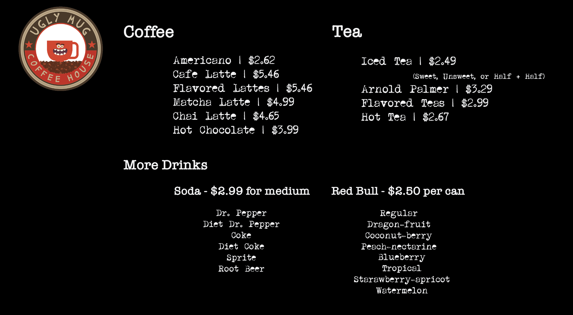 In 2024, I was hired by Jeffrey Poe, the owner of Ugly Mug Coffee House in McKinney, TX, when he was first getting the business off the ground. He needed a graphic designer, so I helped by refining the logo and designing the home screen for their future app. I also created custom apparel and two menus and designed an original logo for the company, though the latter was not needed.